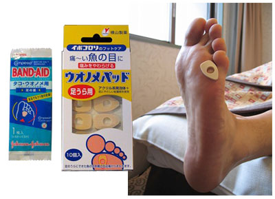 角質層が厚いと接触する部位の圧力が強くなり、タコや魚の目ができやすくなるので、角質層の厚い部分は専用のヤスリなどで削る。 |